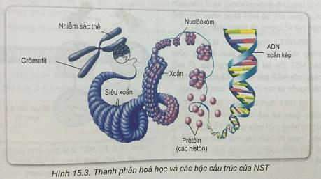 - Từ thông tin có trong hình 15.3, hãy mô tả các mức độ xoắn và cho biết thành phần hóa học của NST là gì?