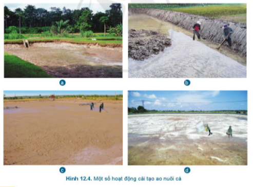 LT: Hãy mô tả các hoạt động cải tạo ao nuôi trong Hình 12.4