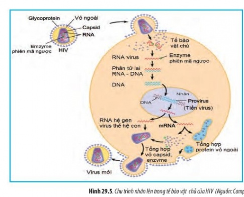 Câu hỏi 5: Quan sát hình 29.5, hãy mô tả quá trình nhân lên của HIV trong tế bào vật chủ.