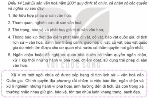 a) Chính quyền và nhân dân xã V đã thực hiện các quy định của pháp luật về quyền và nghĩa vụ của các tổ chức, cá nhân trong việc bảo vệ di sản văn hóa như thế nào?