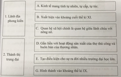 Câu 5. Hãy ghép ý ở cột A với ý ở cột B sao cho đúng với đặc điểm của lãnh địa phong kiến và thành thị trung đại ở Tây Âu.
