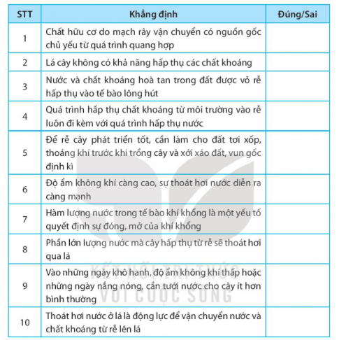 Giải bài tập sách bài tập (SBT) bài 30: Trao đổi nước và dinh dưỡng ở thực vật