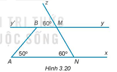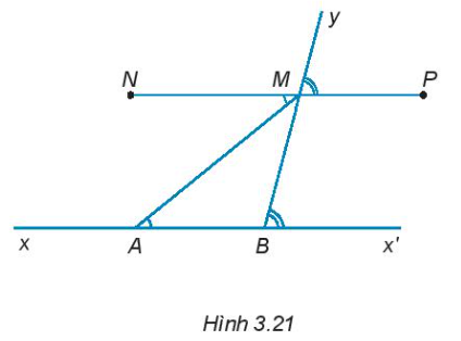3.21. Cho đường thẳng xx', điểm A thuộc xx'. Trên tia Ax' lấy điểm B (điểm B khác điểm A). Vẽ tia By, trên tia By lấy điểm m. Hai điểm N và P thỏa mãn $\widehat{NMA}=\widehat{MAB},\widehat{PMy}=\widehat{MBx'}$ (H.3.21). Giải thích tại sao ba điểm N, M, P thẳng hàng.