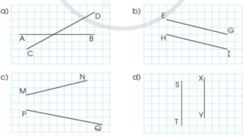 Nêu các cặp đường thẳng song song với nhau, các cặp đường thẳng không song song với nhau trong mỗi hình dưới đây:
